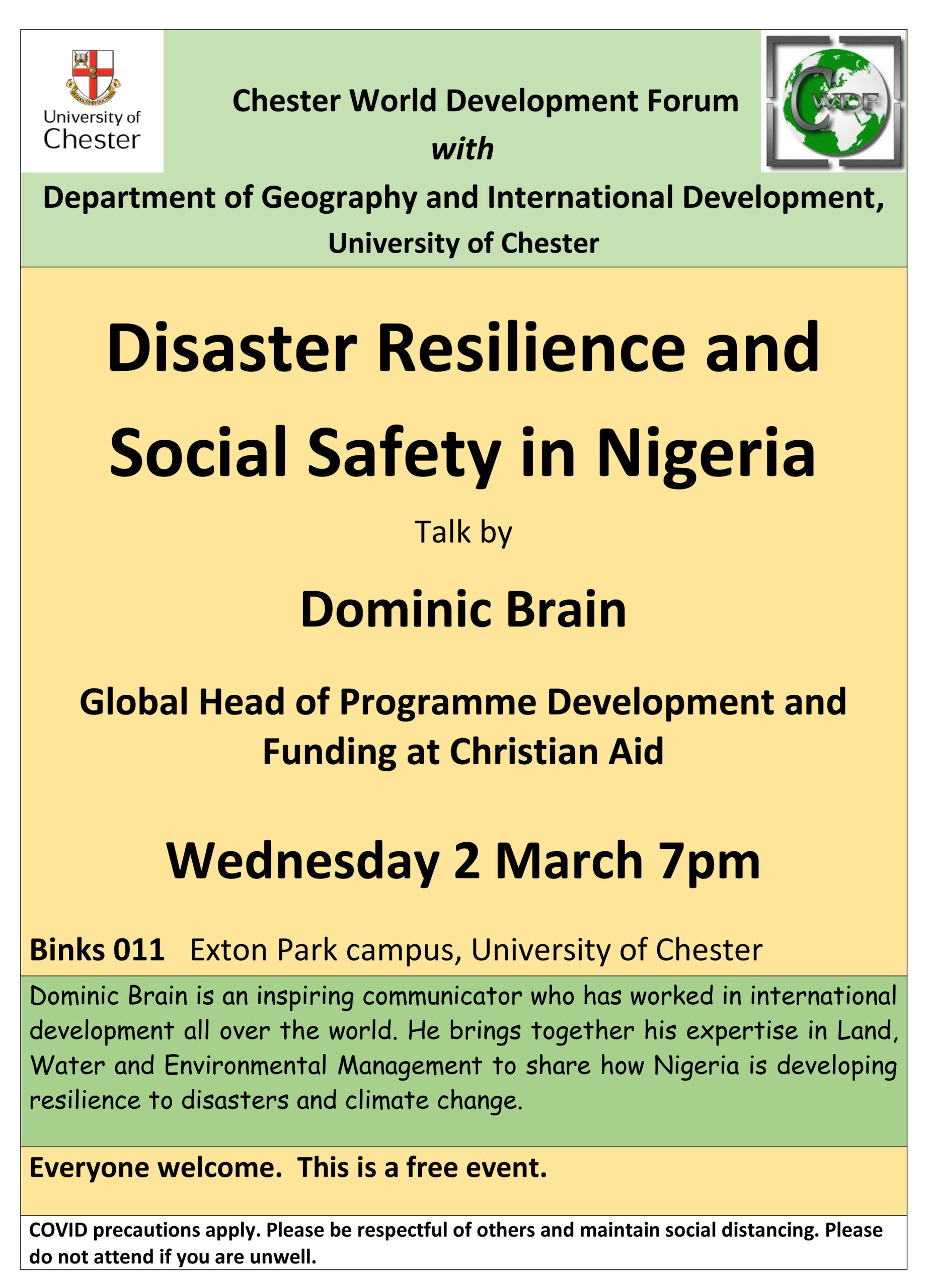 We have a speaker from Christian Aid, Dominic Brain, who will be telling us about “Disaster Resilience and Social Safety in Nigeria”.