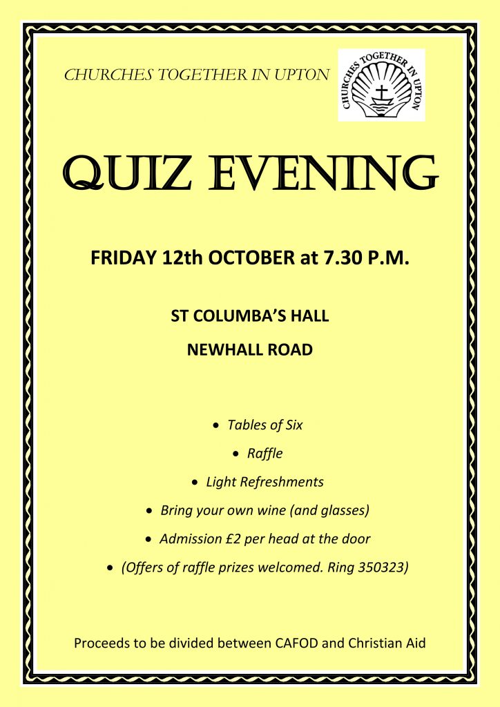 This Quize Evening is an annual event organised by Churches Together as a fund raiser for CAFOD and Christian Aid. £2 per head entry, including light refreshments. Make up teams of 6 on the night. Bring own wine (and glasses). Contact 01244 350323.