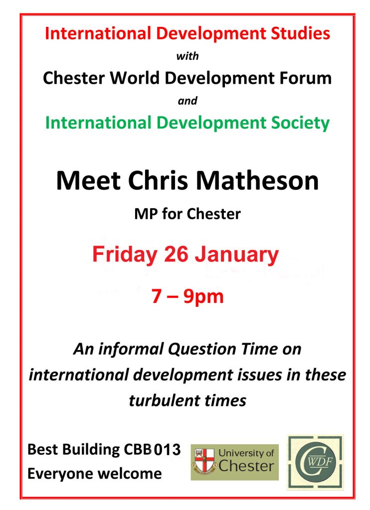 An informal meeting with Chester MP Chris Matheson. This is being arranged in association with the University’s International Development Society. (This is the session originally scheduled for 3rd October 2017.)