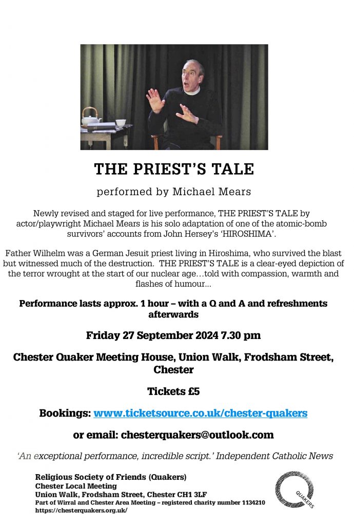 Michael Mears brought his production of “The Mistake” to Wesley Centre, Chester last year. This year Chester Quakers will be putting on his latest production, “The Priest’s Tale” at the Chester Quaker Meeting House. The actor/playwright has made a new solo adaptation from John Hersey’s “Hiroshima” – an account by one of the very few survivors of the atomic bomb attack.