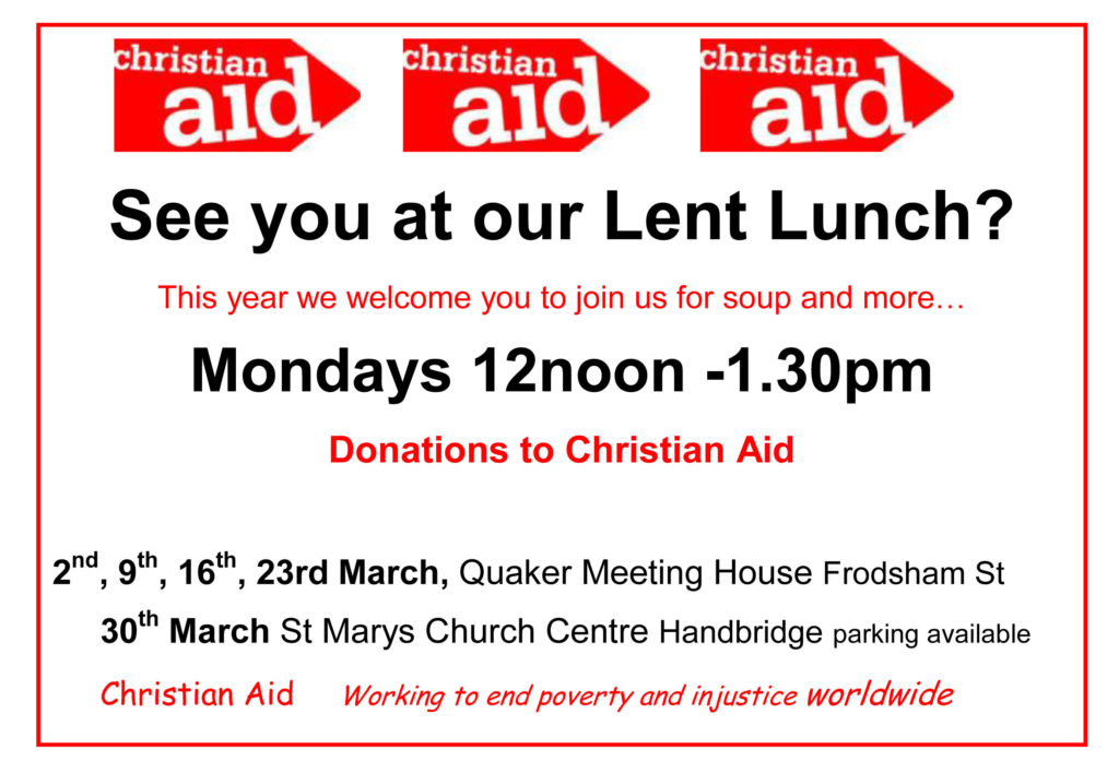 Arranged by City Centre Churches Together. Please join us for a simple meal. £5 donations to Christian Aid: “Working to end poverty and injustice worldwide”. 01244 375606.
