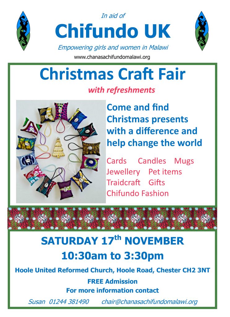 Craft Fair organised in aid of Chifundo UK, in support of their projects empowering girls and women in Malawi. Free admission. With refreshments. “Come and find Christmas presents with a difference and help change the world”.