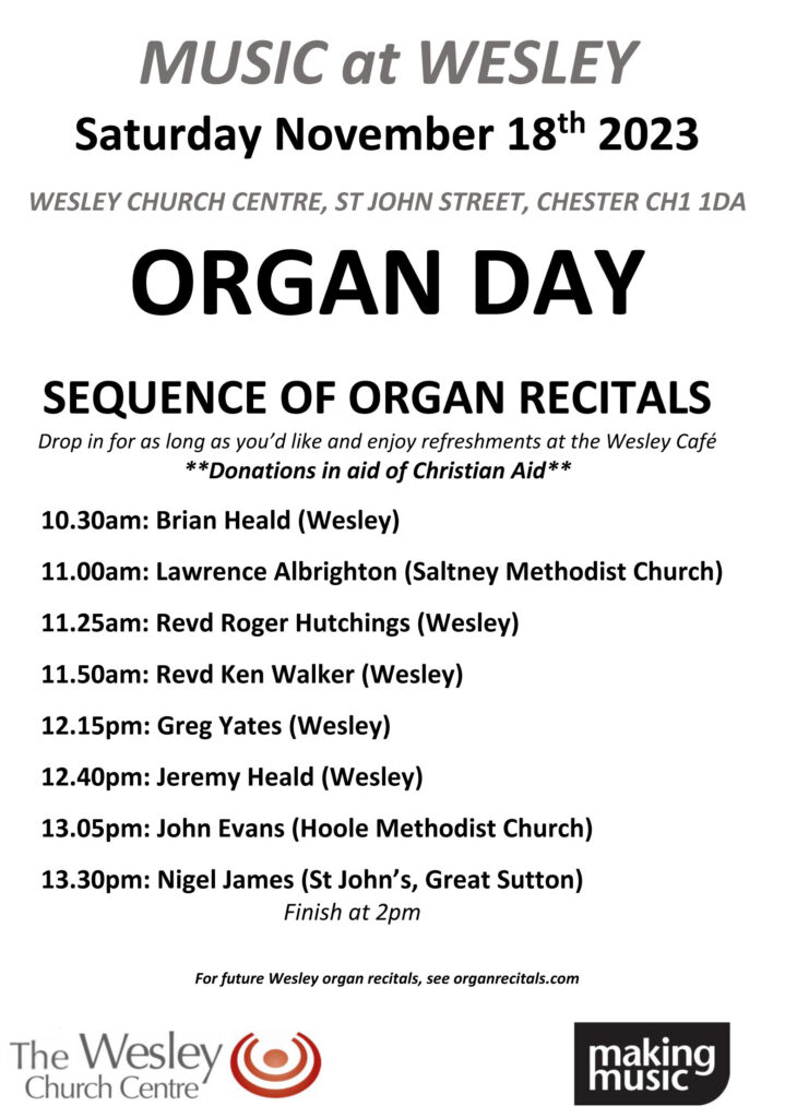 Sat 18 Nov: “Organ Day” at the Wesley Church Centre, St. John Street, Chester CH1 1DA