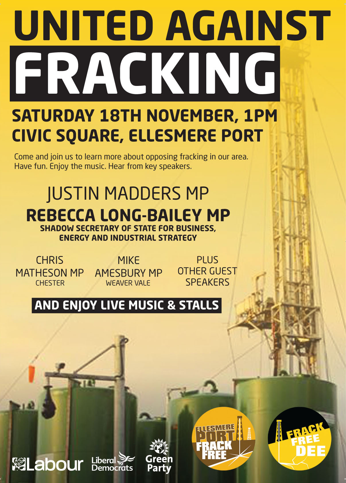 A public gathering to learn more about opposing fracking in the local area. Enjoy live music and stalls. Hear from key speakers including local MPs Justin Madders, Chris Matheson and Mike Amesbury, and Rebecca Long-Bailey MP Shadow Secretary of State for Business, Energy and Industrial Strategy.