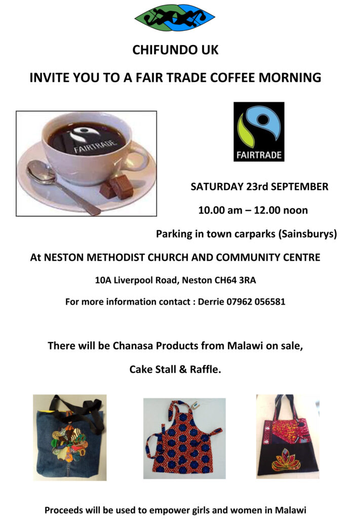 Saturday 23 September: Chifundo Fairtrade Coffee Morning, 10-12 at the Neston Methodist Church and Community Centre, 10A Liverpool Road, Neston CH64 3RA.