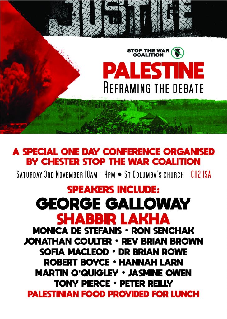 This day for Palestine, organised by Stop the War Coalition, Chester, will involve speakers from a wide variety of political, religious, media, academic, social justice, NGO and civil society backgrounds, who help explore ways to promote peace and justice for the Palestinian people.
