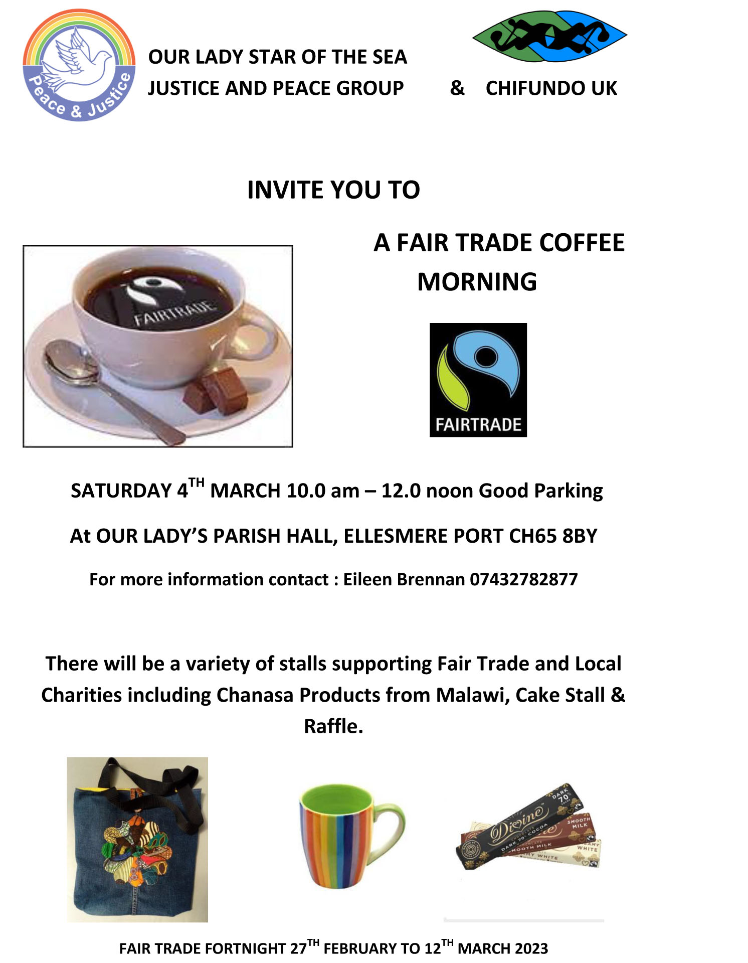There will be a variety of stalls supporting Fair Trade and local charities including Chifundo selling Chanasa Products from Malawi, a Cake Stall, and a Raffle. There is parking on the site. For more information, contact: Eileen Brennan 07432 782 877.