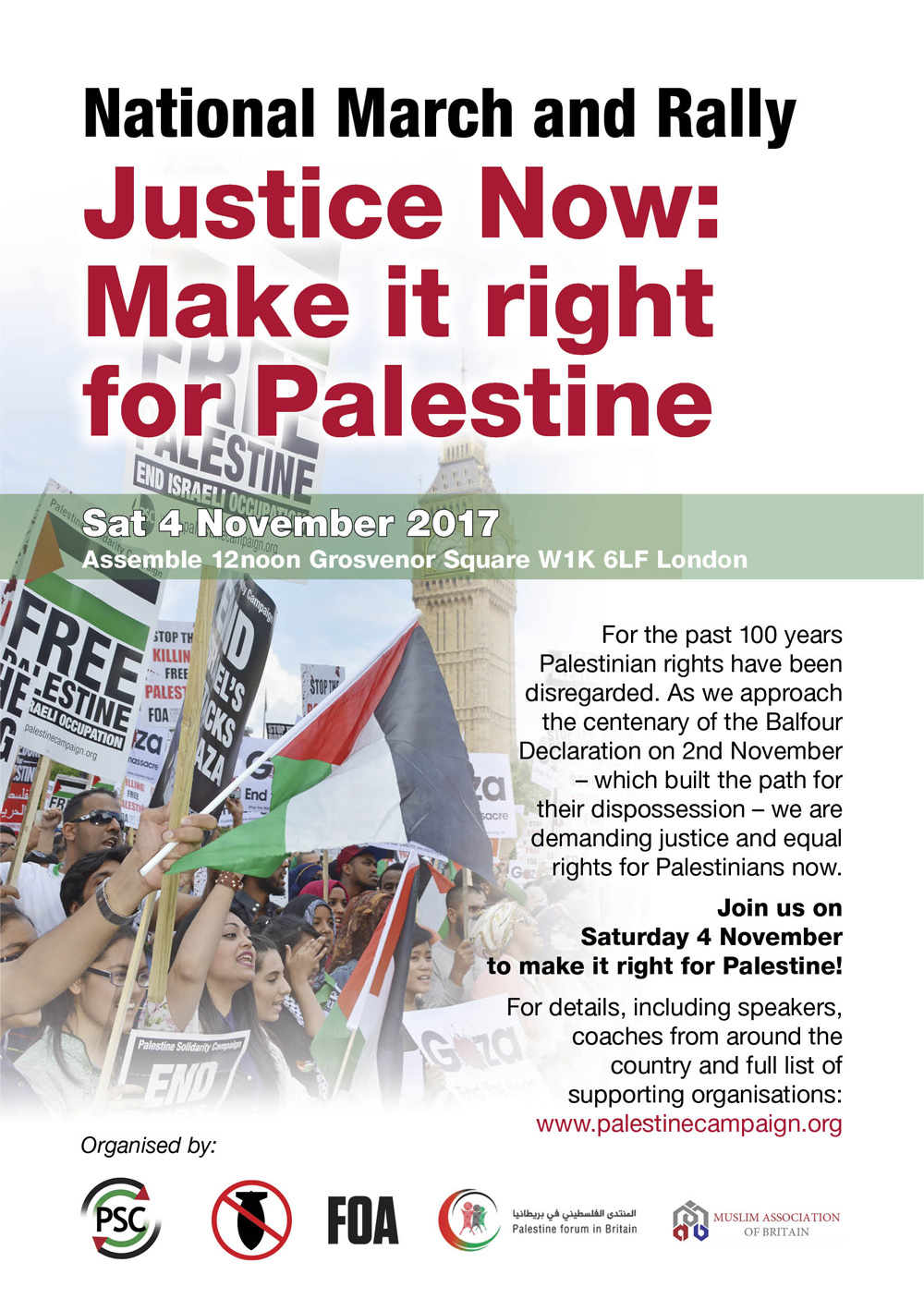 For the past 100 years Palestinian rights have been disregarded. At the centenary of the Balfour Declaration – 2nd November – which built the path for their dispossession, we are demanding justice and equal rights for Palestinians now. Join the national demonstration to call on the government to make it right for Palestine. www.palestinecampaign.org