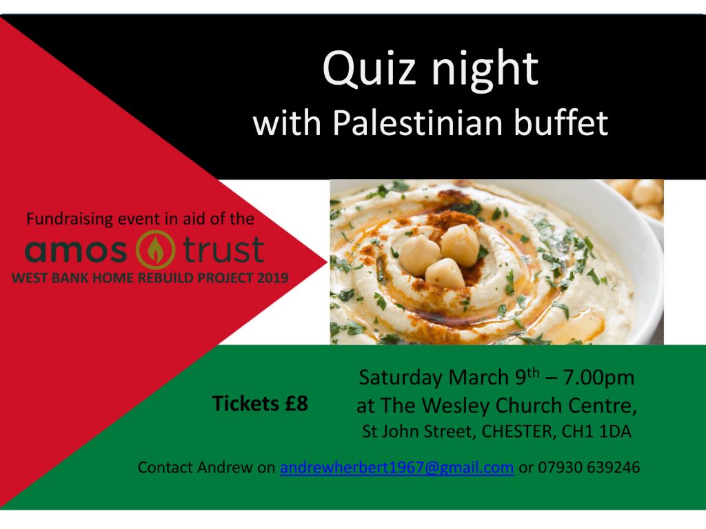 This Quiz Night is a fund raising event in aid of the Amos Trust West Bank Home Rebuild Project 2019. The evening includes a Palestinian Buffet.
