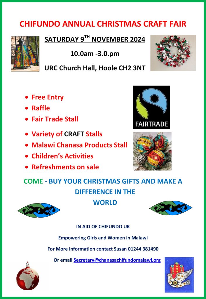 This is Chifundo’s Annual Christmas Craft Fair, featuring a variety of craft stalls, along with children’s activities, refreshments for sale, and a Fairtrade stall. There are one or two free stalls and anyone interested can contact Lynn Walton treasurer@chanasachifundomalawi.org The stalls are £12.