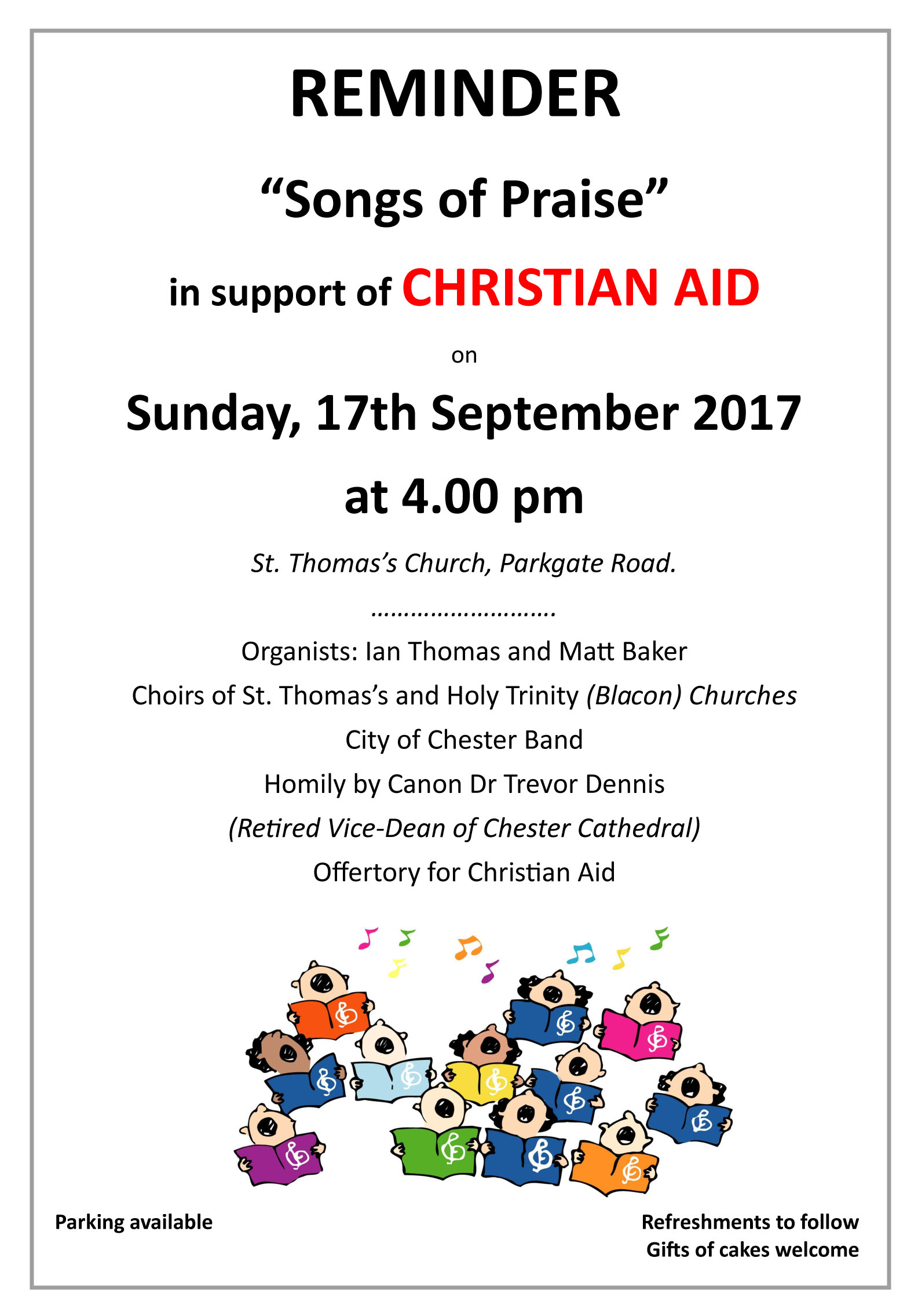 This “Songs of Praise” service is being held in support of Christian Aid. Organists Ian Thomas and Matt Baker with the choirs of St Thomas and Holy Trinity Blacon. Homily Canon Dr Trevor Dennis. Refreshments to follow, gifts of cakes welcome. Contact 01244 375606.