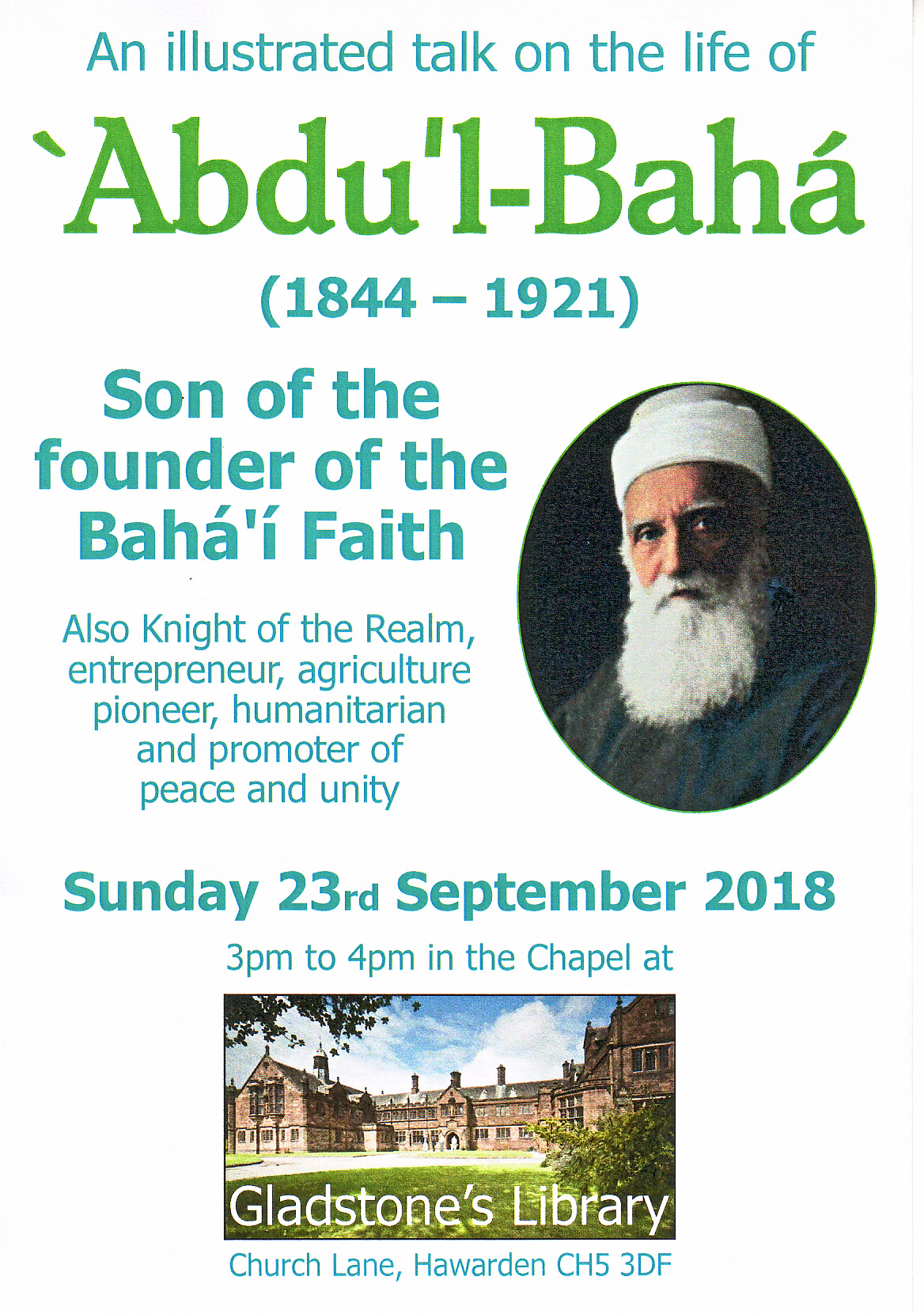Sun 23rd Sept – Talk on the life of Abdu’l-Baha