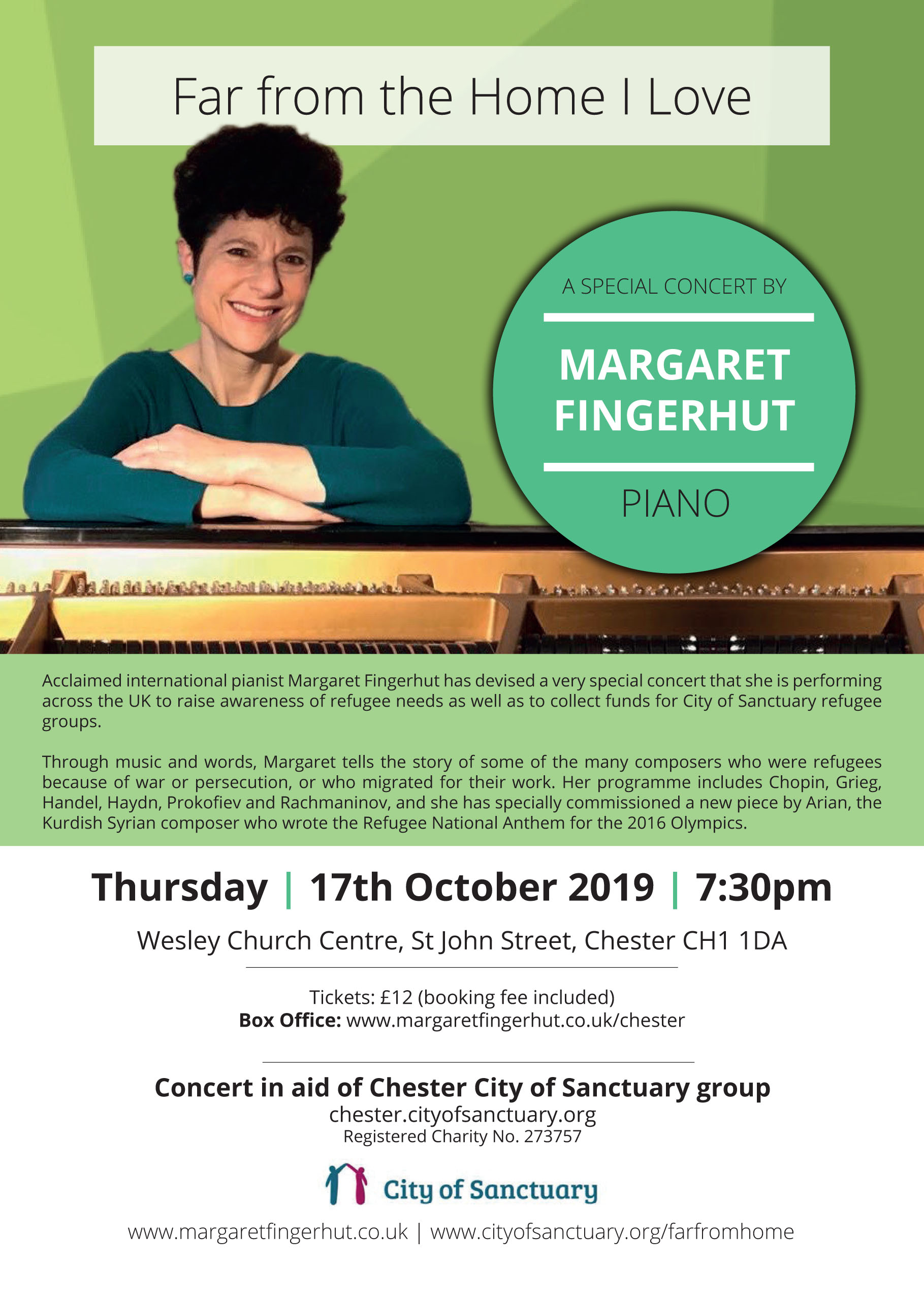 Acclaimed international pianist Margaret Fingerhaut has devised a very special concert that she is performing across the UK to raise awareness of refugee needs as well as to raise funds for City of Sanctuary refugee groups. The programme will feature the music and stories of some of the many composers who were themselves refugees or migrants. Tickets £12 available via www.margaretfingerhaut.co.uk/chester