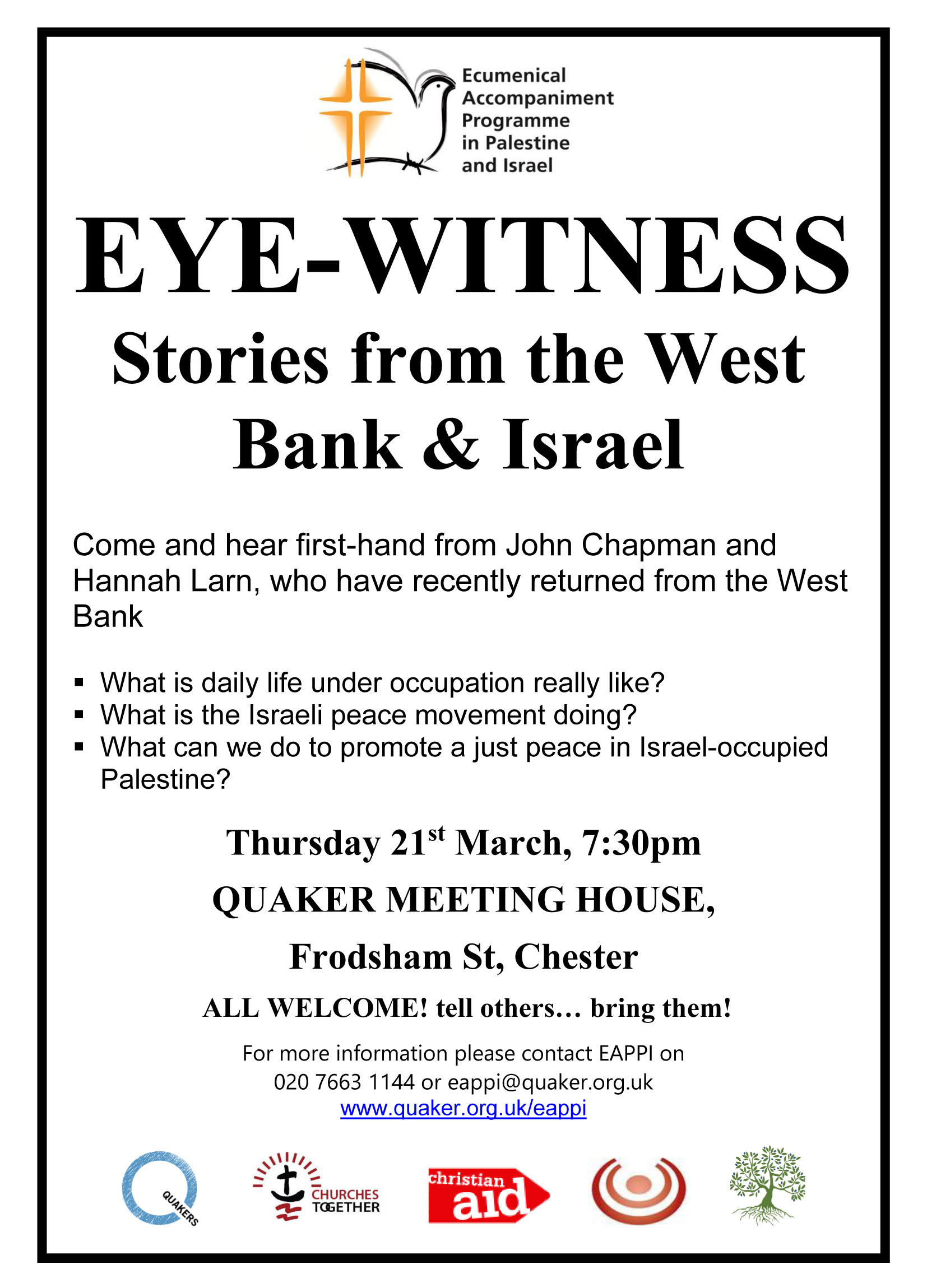 Come and hear first-hand from two recently-returned volunteers from the Quaker’s Ecumenical Accompaniment Programme in Palestine and Israel. What is daily life under the occupation really like? What is the Israeli peace movement doing? What can we do to promote a just peace in Israel-occupied Palestine?
