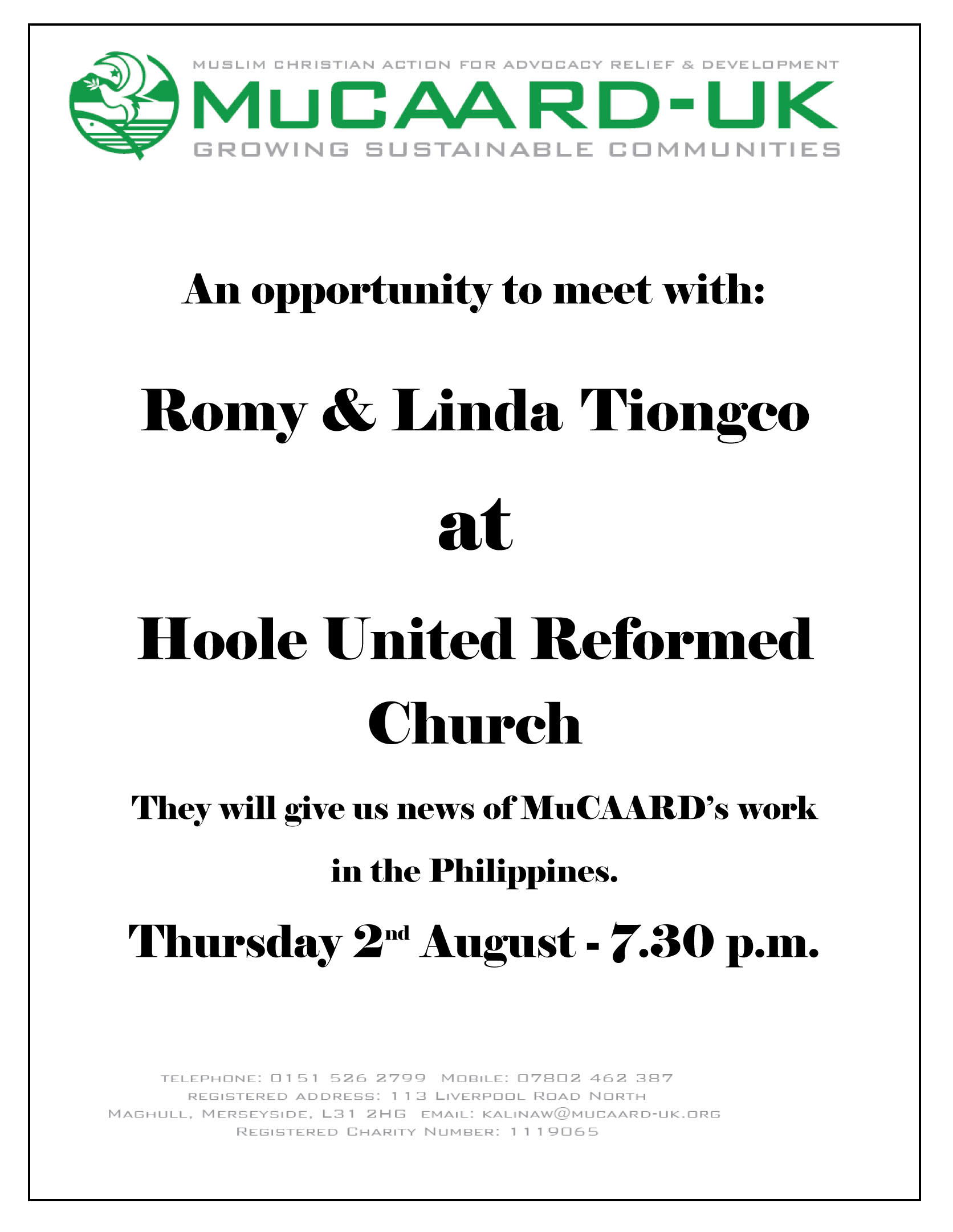 Each Year, when Romy & Linda Tiongco return to the UK for a few weeks, they have valued the times when they have met up again with people from the Chester area to share what they have been doing in Damulog and other areas of Mindanao in the Philippines. We have been inspired by the account of their work amongst the people of Mindanao whom they have helped to work their way to a more prosperous life, often supported by the monies raised through MuCAARD-UK.
