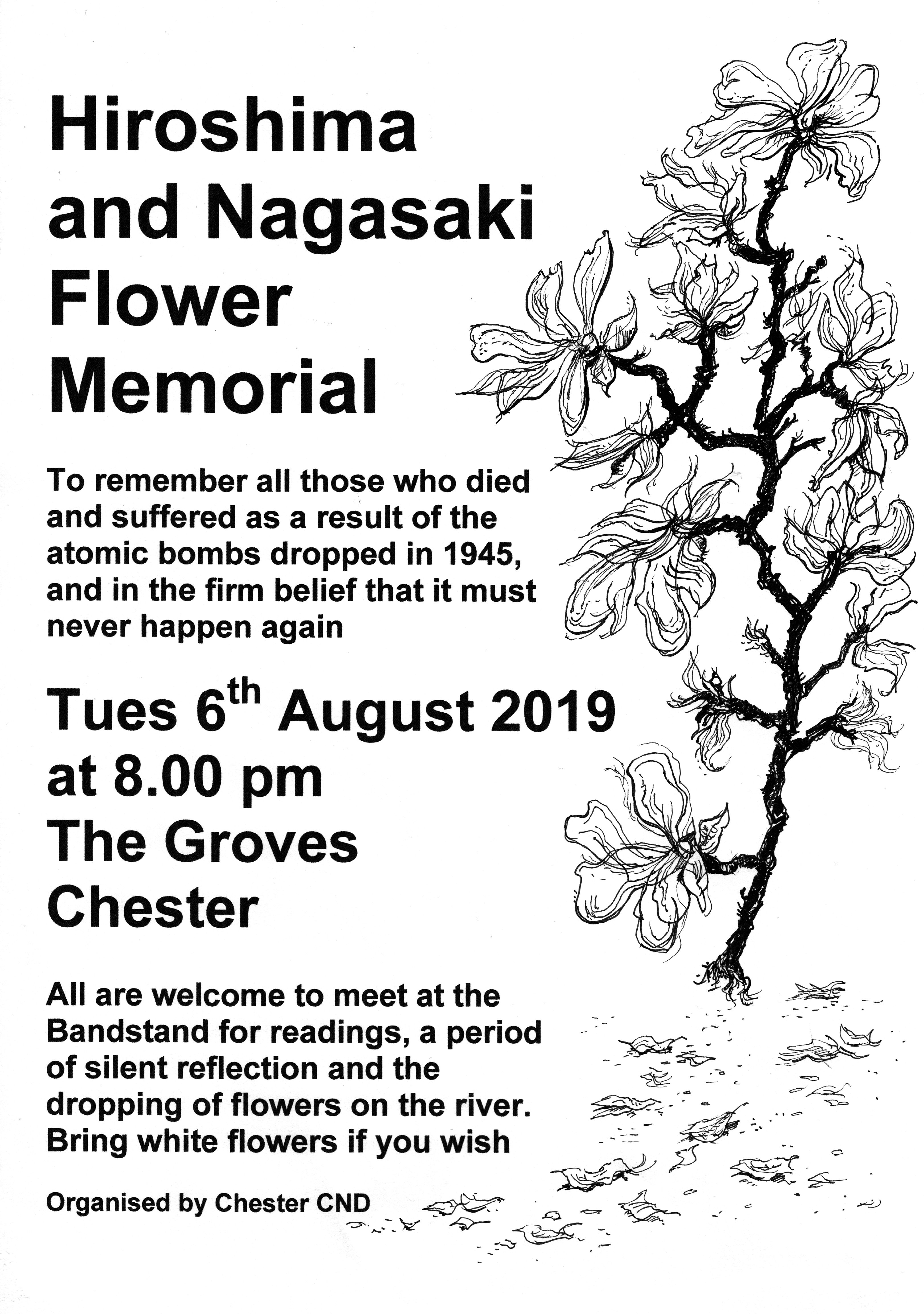 A gathering to remember all those who died and suffered as a result of the atomic bombs dropped in 1945, in the firm belief that it must never happen again. All are welcome to meet at the Bandstand for readings, a period of silent reflection and the dropping of flowers on the river. Bring white flowers if you wish. Organised by Chester CND. chestercnd@gmail.com