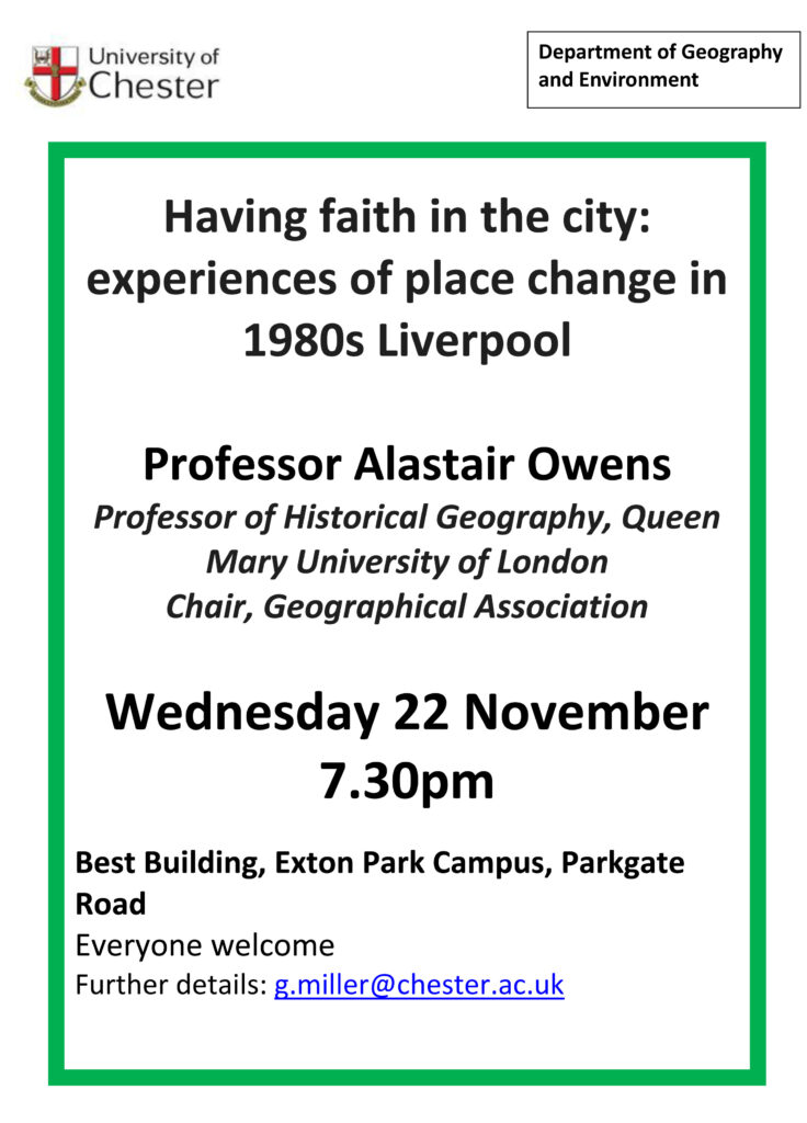Professor Alastair Owens will talk on “Having faith in the city: experiences of place change in 1980s Liverpool”.