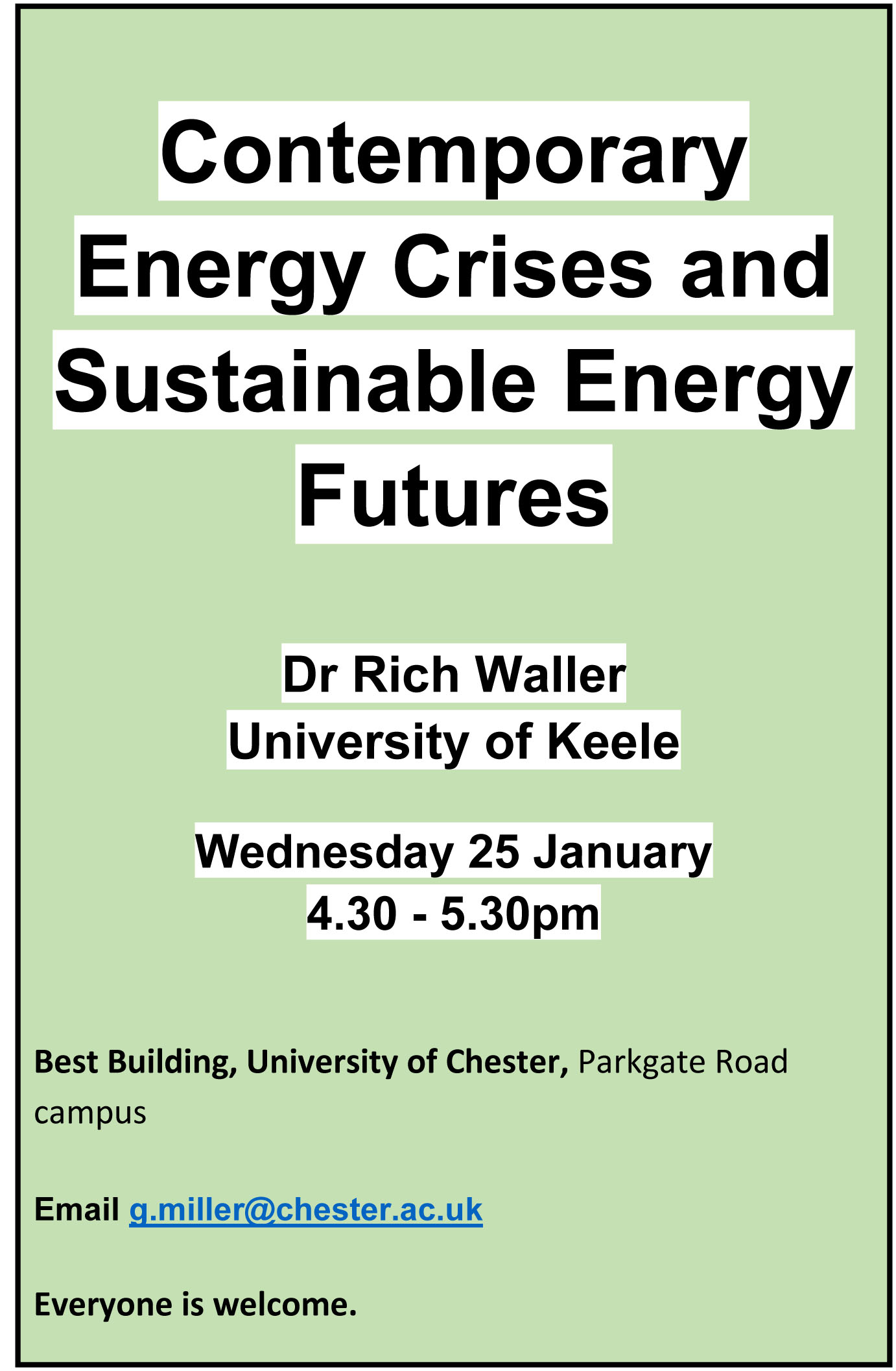 Dr. Rich Waller, Senior Lecturer in Physical Geography at the University of Keele, will give a talk on “Contemporary Energy Crises and Sustainable Energy Futures”.