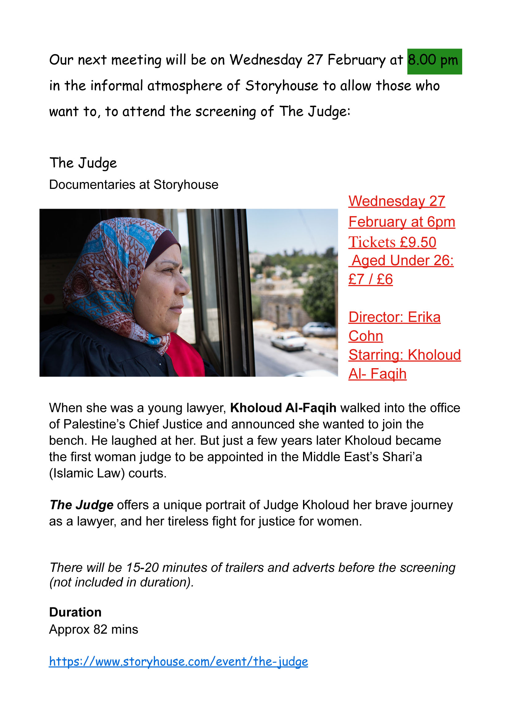 This meeting of Chester Friends of Palestine is in the informal atmosphere of Storyhouse, to allow those who wish to attend the 6.00 pm screening of the documentary film The Judge which offers a unique portrait of Palestinian lawyer Kholoud Al-Faqih’s brave journey as a lawyer, and her tireless fight for justice for women.