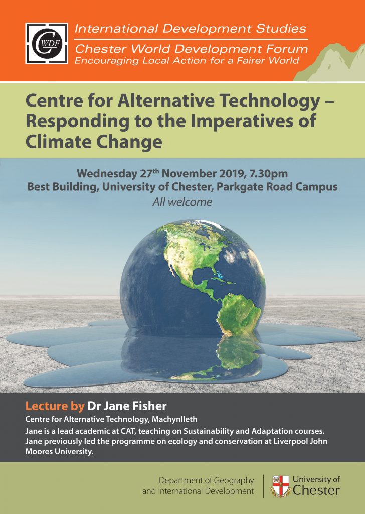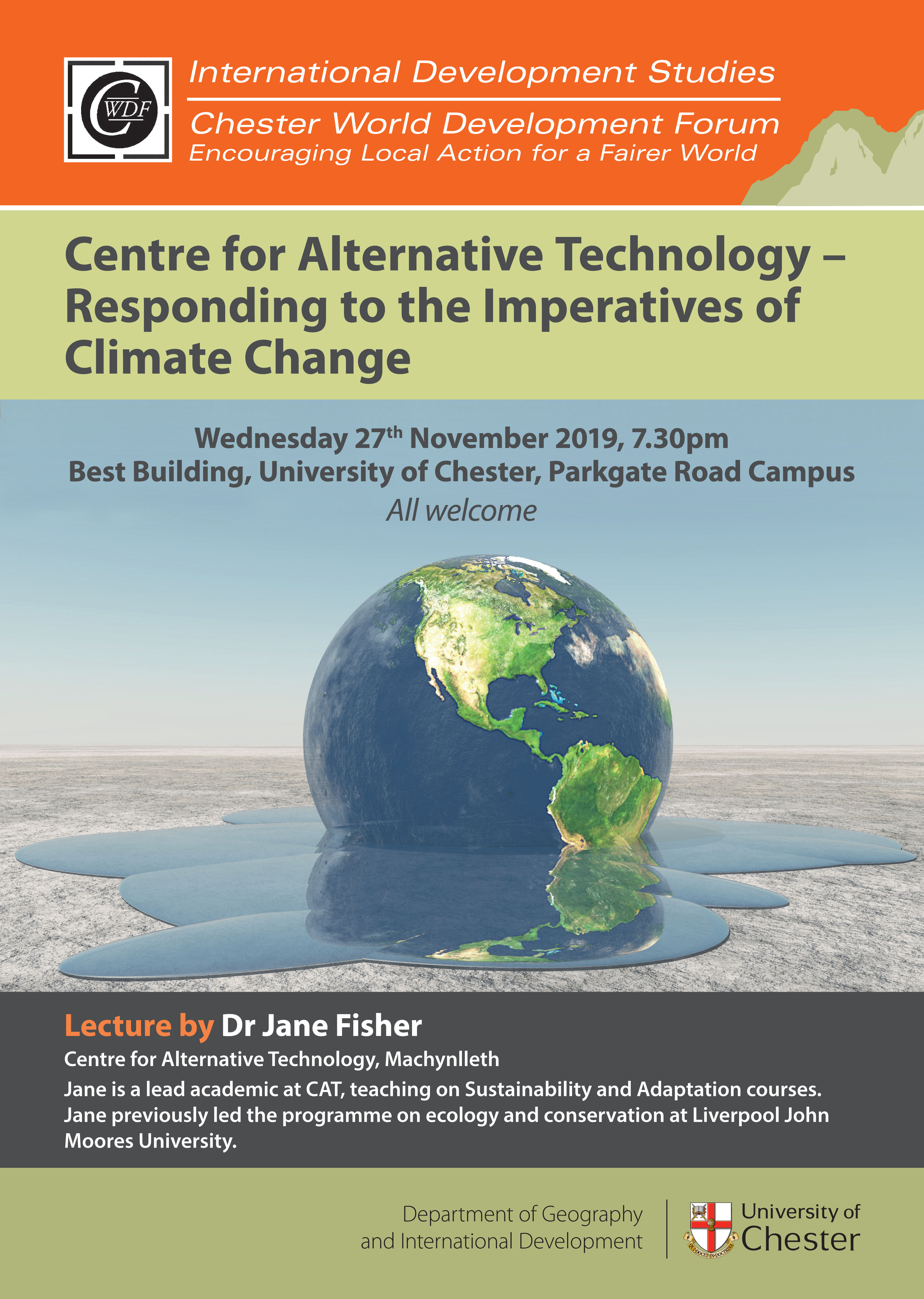 Speaker Dr Jane Fisher, local Chester resident who is a senior lecturer on the staff at CAT. This is an excellent opportunity for a mixed audience to gain insights into the long-established work at CAT in Machynlleth, and how their programmes may be evolving in response to climate change initiatives, global and local.